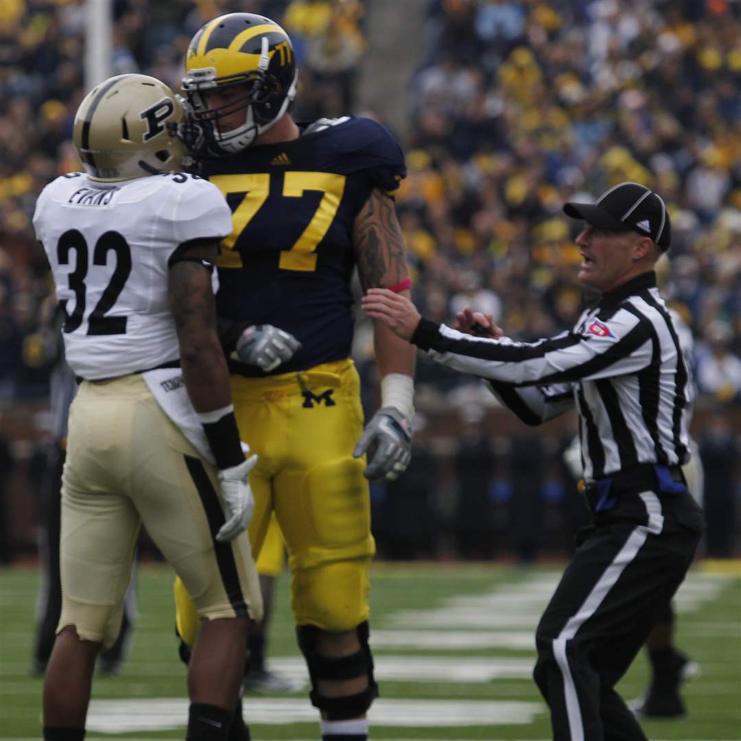 Purdue's Albert Evans and UM's Taylor Lewan get face to face during first half at Michigan Stadium in Ann Arbor, Mich.