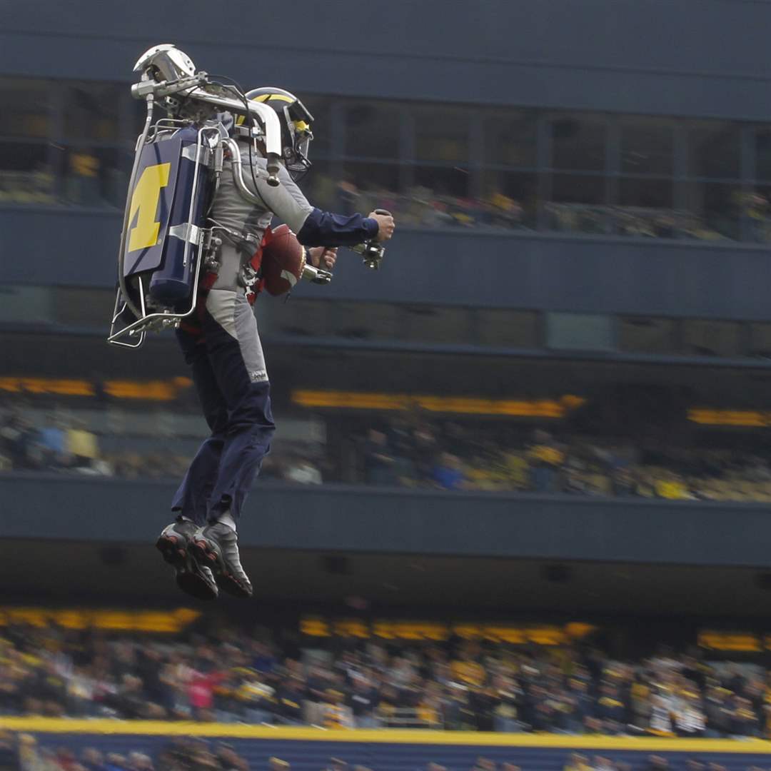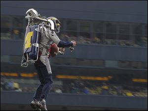 The Rocket Man flies in the game ball prior to start of game against Purdue at Michigan Stadium in Ann Arbor, Mich.
