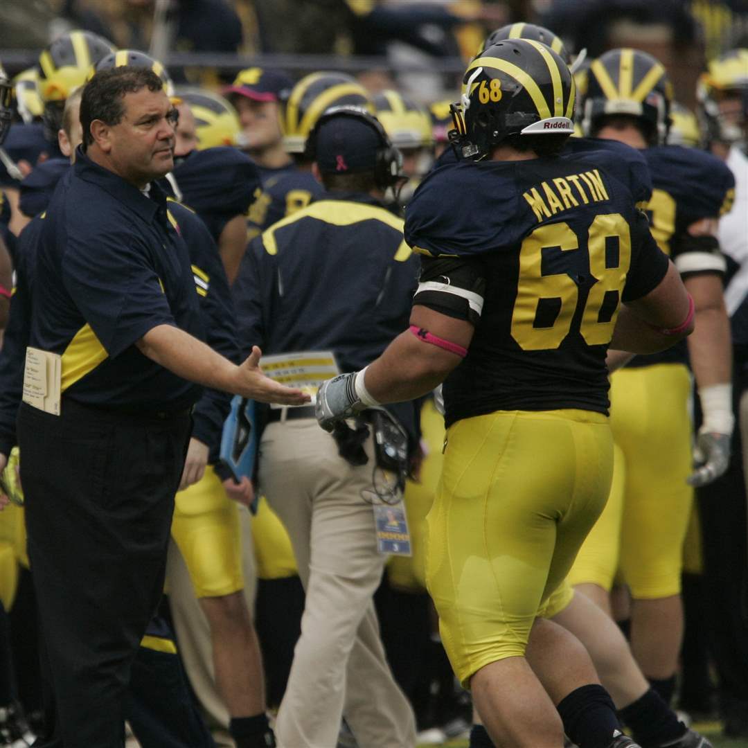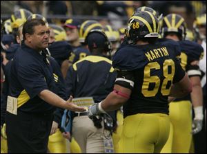 UM head coach Brady Hoke shakes hands with Mike Martin after Martin forced a Purdue safety during first half at Michigan Stadium in Ann Arbor, Mich.