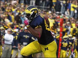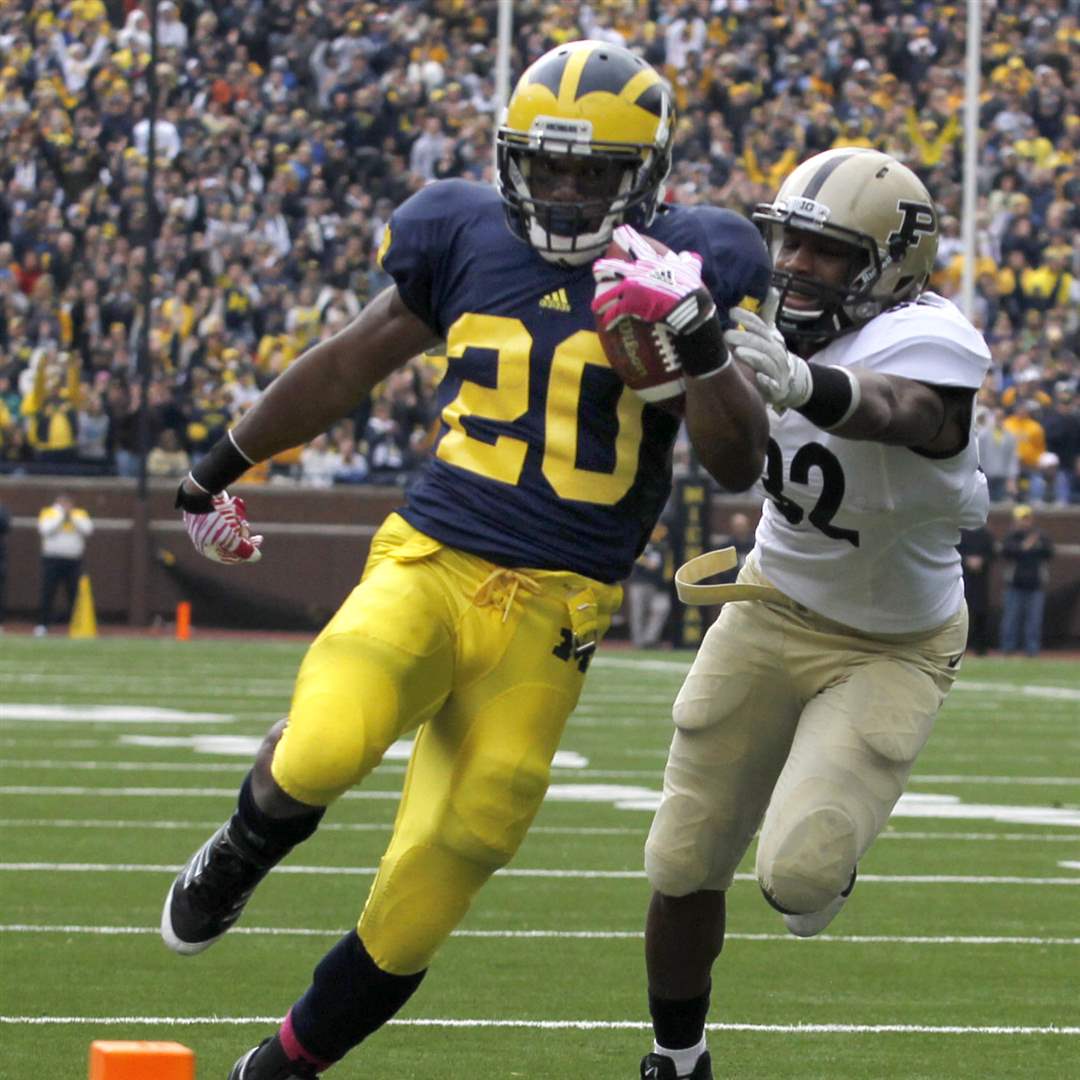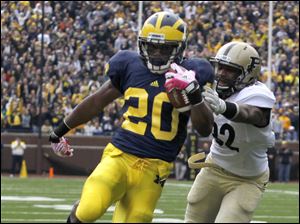UM's Michael Shaw, staying out of reach of Purdue's Albert Evans, scores a touchdown during 2nd half at Michigan Stadium in Ann Arbor, Mich.