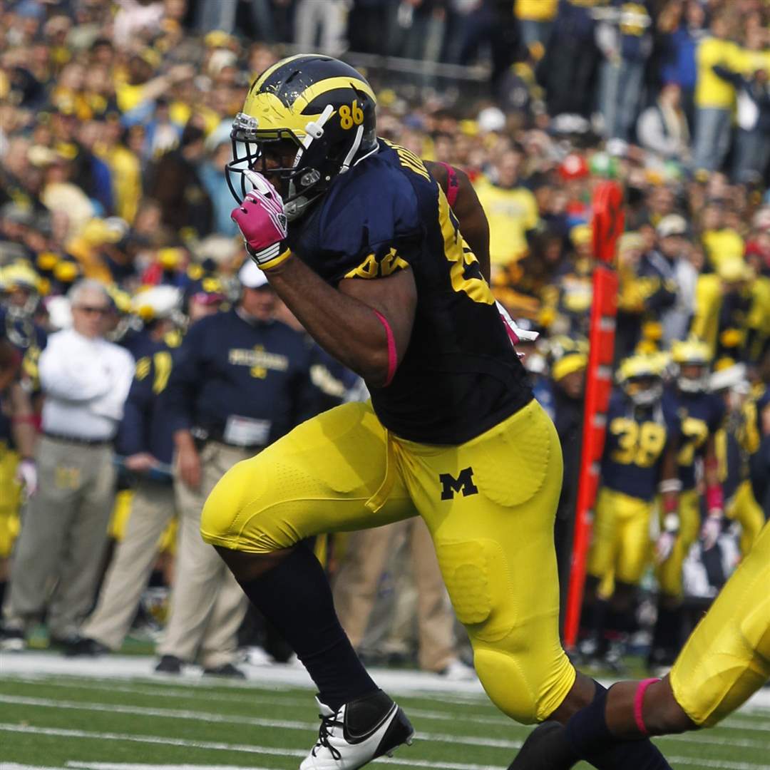 UM tight end Kevin Koger runs on a play during first half at Michigan Stadium in Ann Arbor, Mich.
