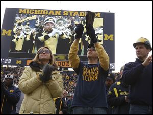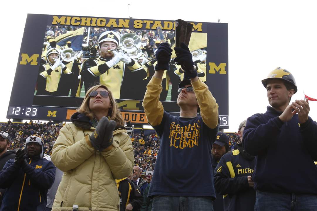 From left: Taylor Webb, of Flint, Mich., and Sylvania, Ohio residents David Wise and Jarman Davis cheer for the band before the start of the Purdue game at Michigan Stadium in Ann Arbor, Mich.