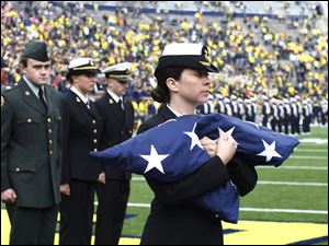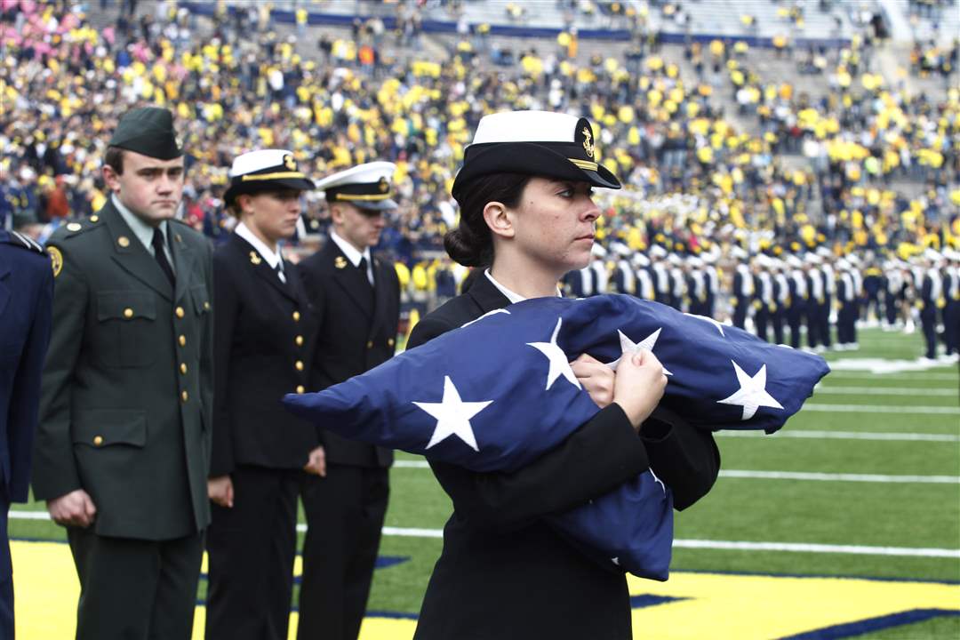 UM Navy ROTC member Brooke Schaffer carries the U.S. flag to the flagpole during first half at Michigan Stadium in Ann Arbor, Mich.