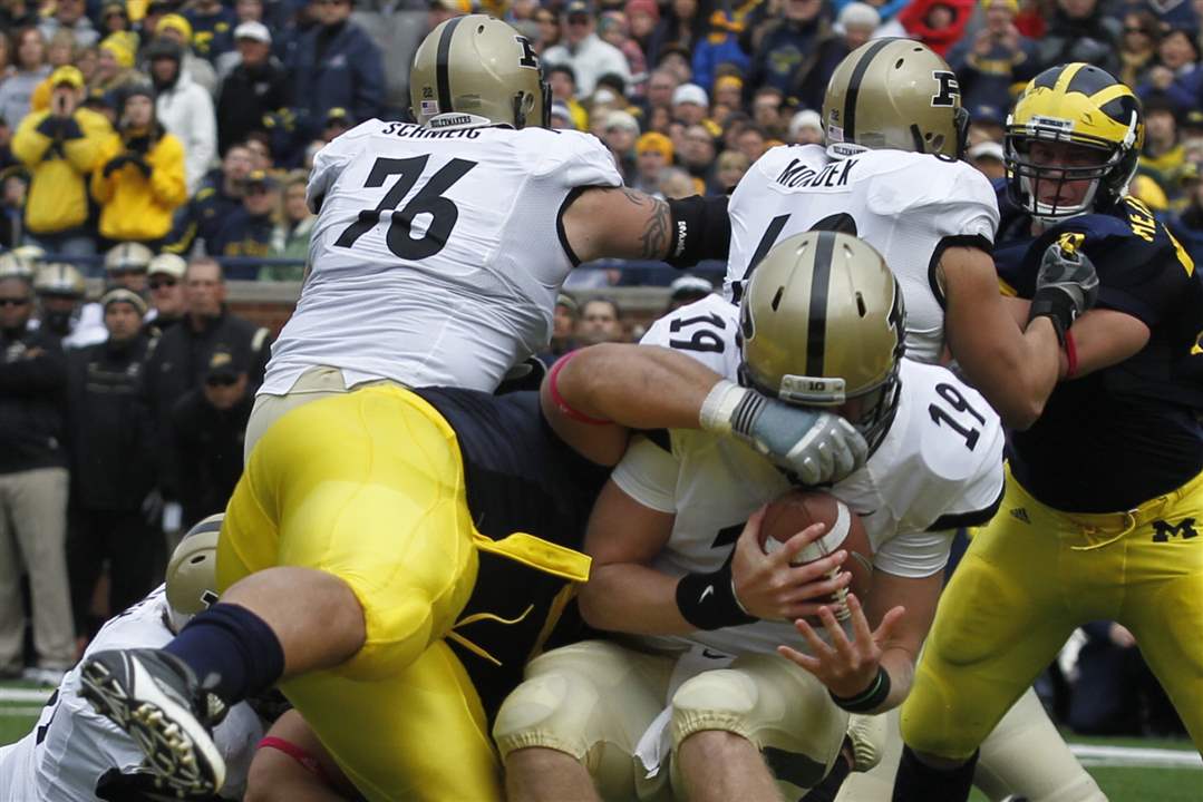 UM's Mike Martin sacks Purdue quarterback Caleb TerBush to force a touchback during first half at Michigan Stadium in Ann Arbor, Mich.