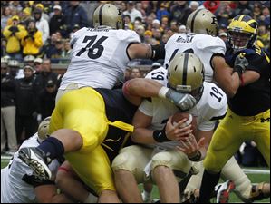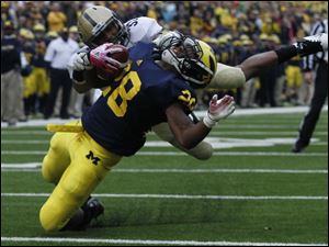 Purdue's Albert Evans has his hand on the ball as UM's Fitzgerald Toussaint scores during first half at Michigan Stadium in Ann Arbor, Mich.