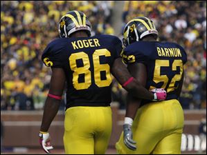 UM's Kevin Koger helps off injured teammate Ricky Barnum during first half at Michigan Stadium in Ann Arbor, Mich.