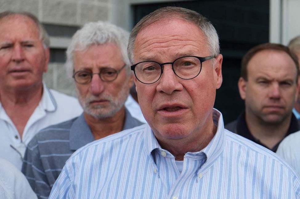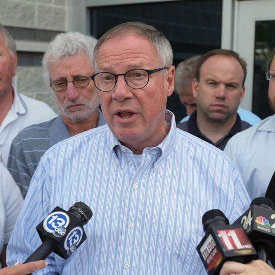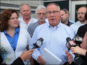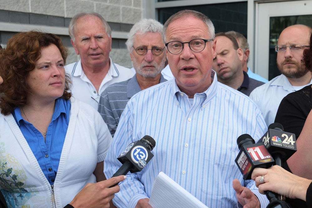 Flanked by city councilman Lindsay Webb, and Lucas County Health Commissioner Dr. David Grossman, Toledo Mayor D. Michael Collins gives an update on water testing during a morning news conference today downtown.