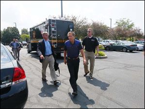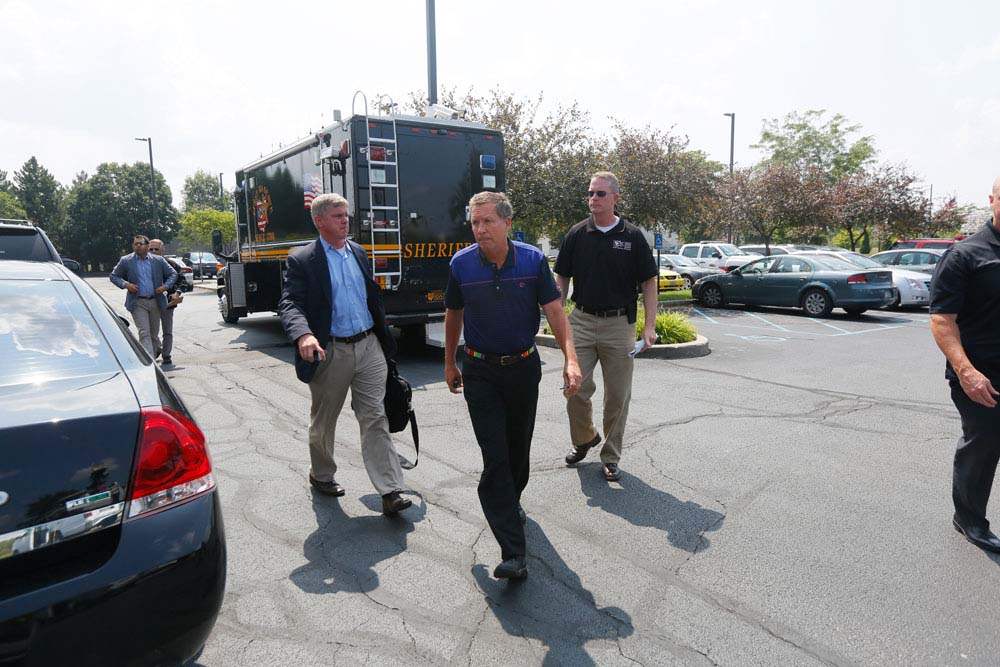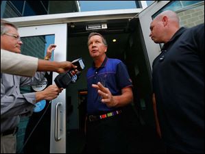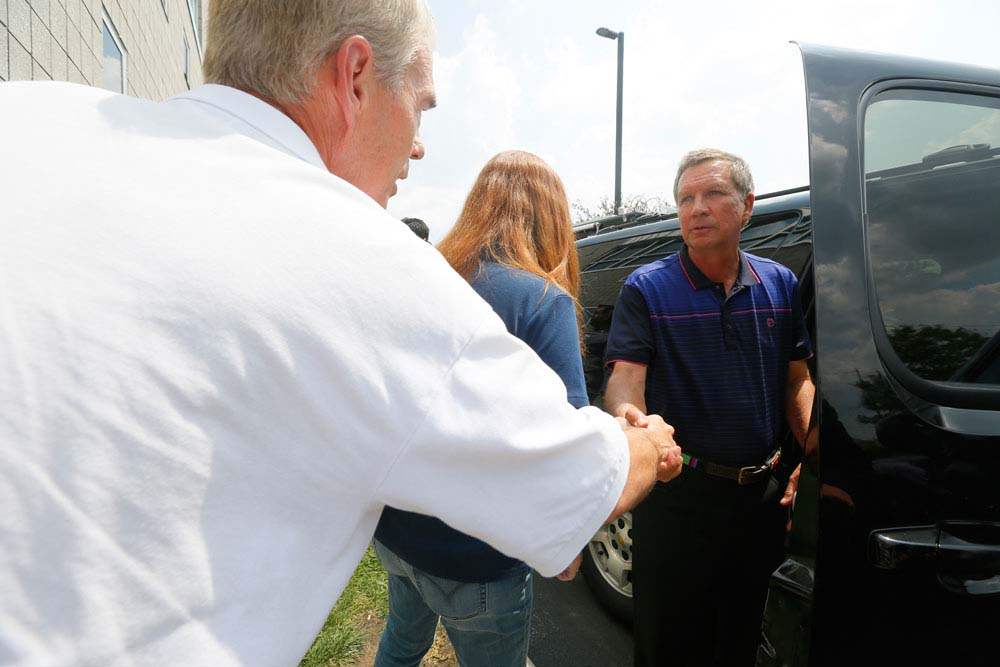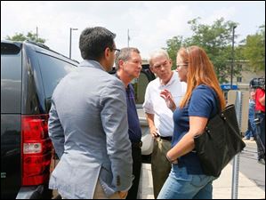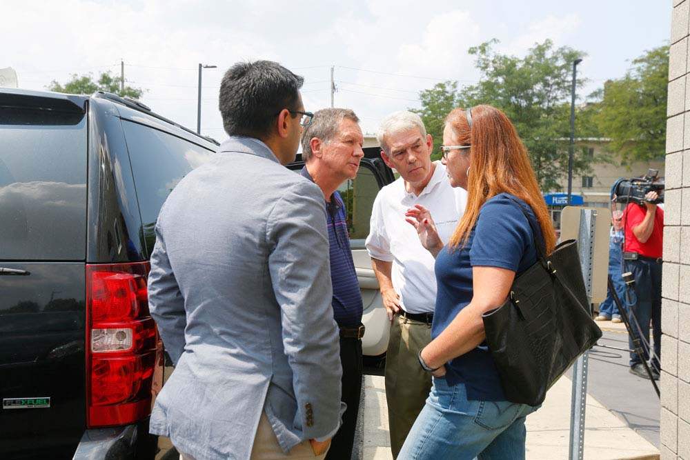 Ohio Gov. John Kasich arrives with staff for a closed door meeting with Mayor D. Michael Collins and other dignitaries to address the water emergency in Toledo.