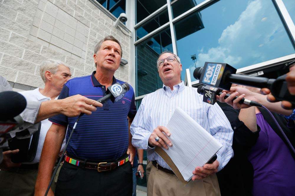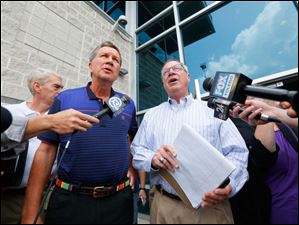 Ohio Gov. John Kasich, left, and Mayor D. Michael Collins speaks to the media after a closed door meeting to address the water emergency in Toledo.