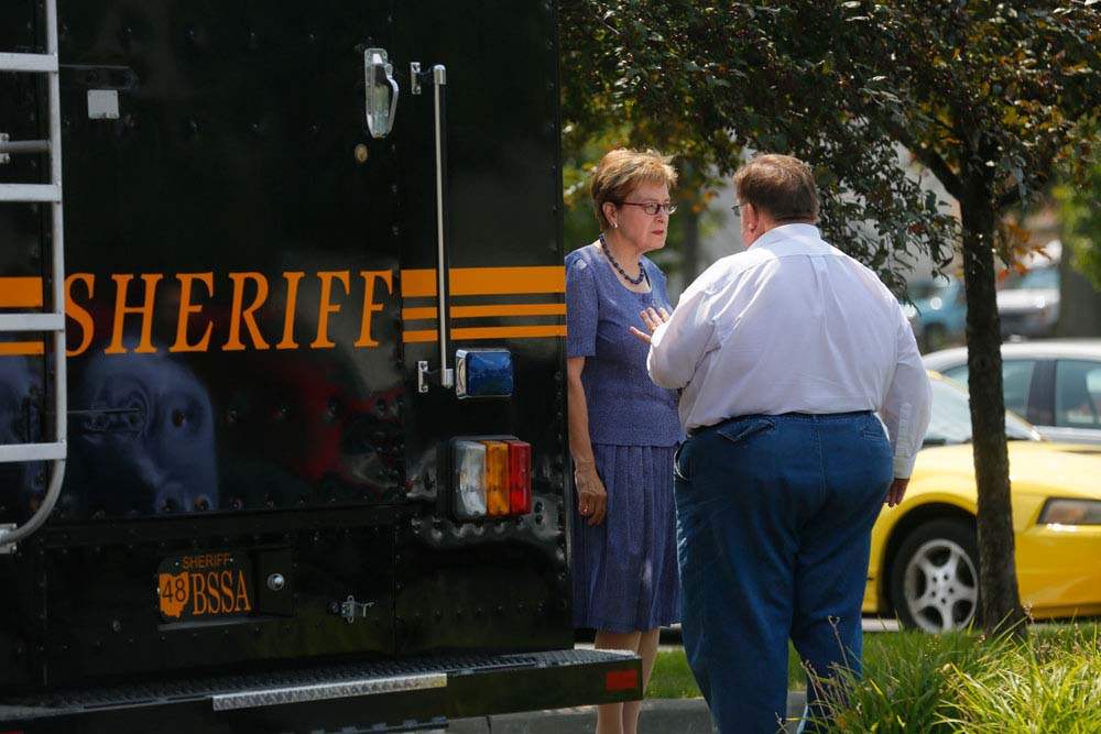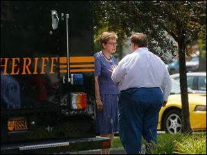 U.S. Rep. Marcy Kaptur, left, and Peter Uvagi, right, talk before Kaptur attends a closed door meeting with Gov. Kasich to address the water emergency in Toledo.