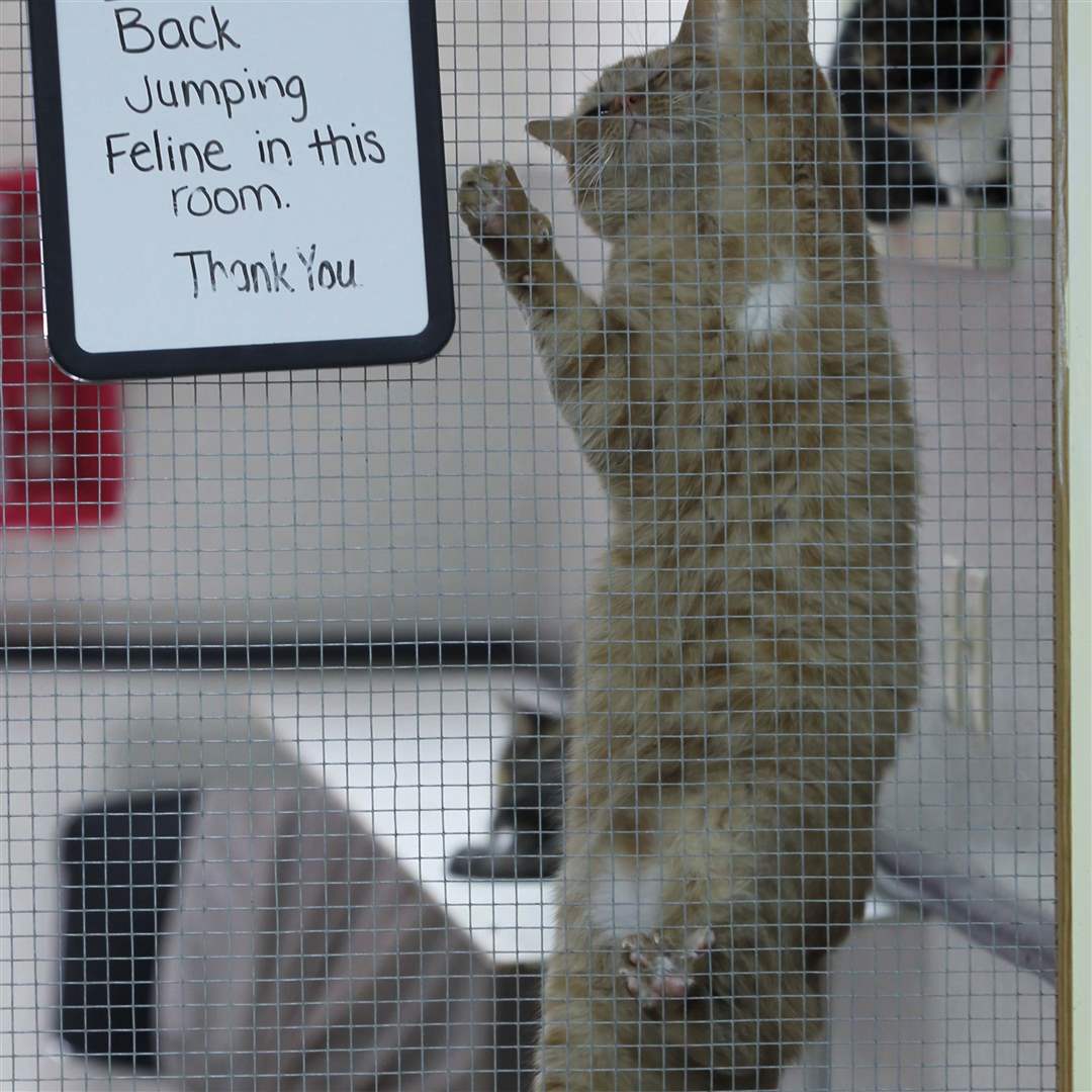 A cat climbs a caged door. This is not one of the confiscated cats.