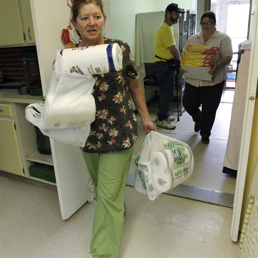 Worker Vickie Ditslear, left, carries donated supplies for the Humane Society in Fremont, Ohio. Fremont resident Jodi Shanahan, behind her, heard about the cats and brought in donated supplies, including boxes of canned food.