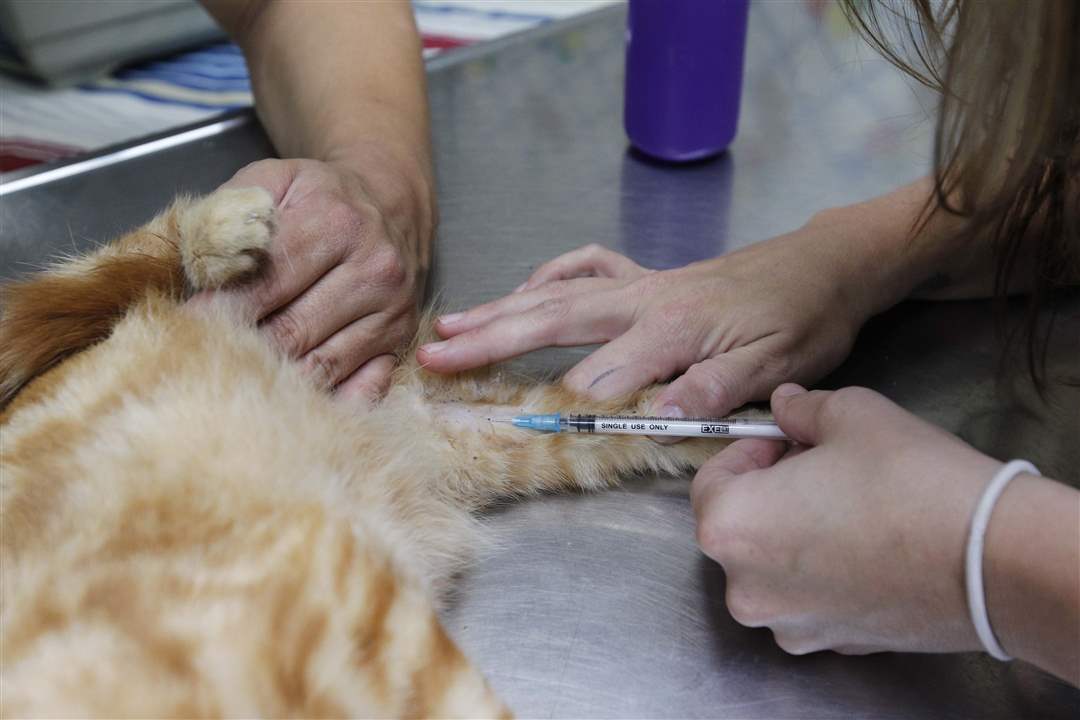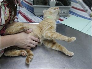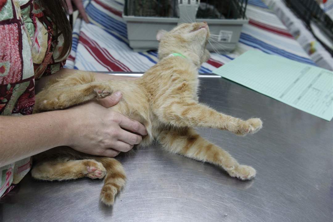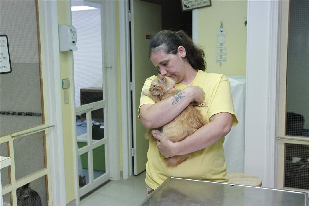 Medical manager Megan Hobbs feels the belly of one of the confiscated cats that was tested for feline leukemia.