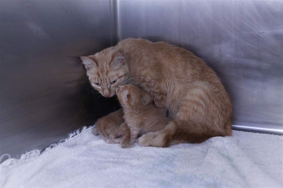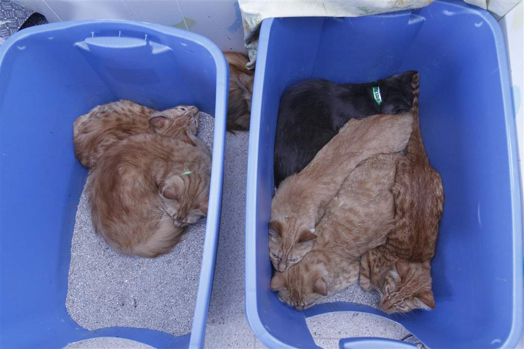 One of the confiscated cats is reunited with her litter after being tested for feline leukemia.