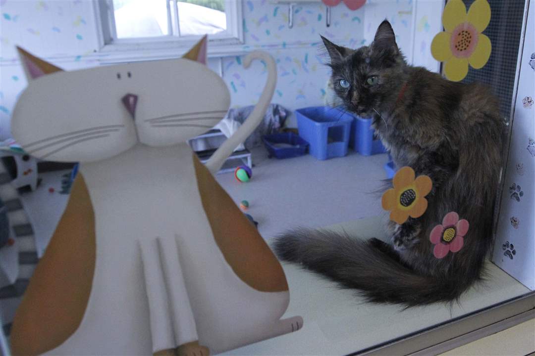 Fremont resident Jodi Shanahan peeks into the cat room. She heard about the cats and brought in donated supplies.