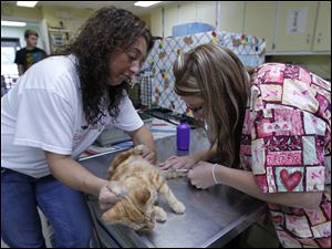 Animal cruelty investigator and shelter manager Kelly Askins, left, and medical manager Megan Hobbs test one of the confiscated cats for feline leukemia.