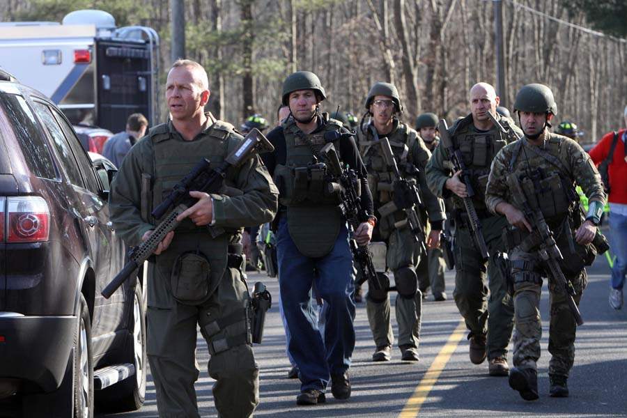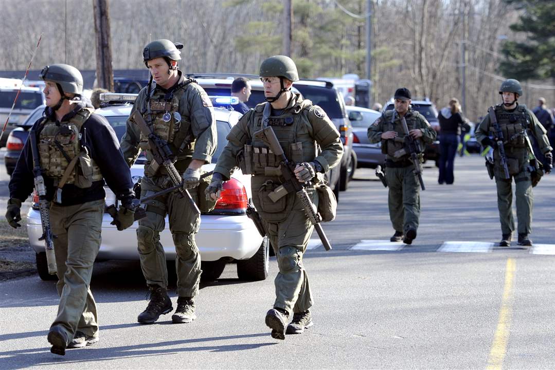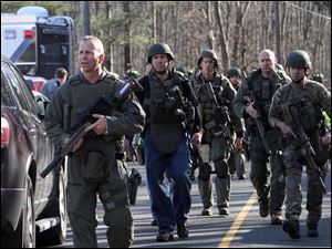 Law enforcement canvass the area following a shooting at the Sandy Hook Elementary School in Newtown, Conn.