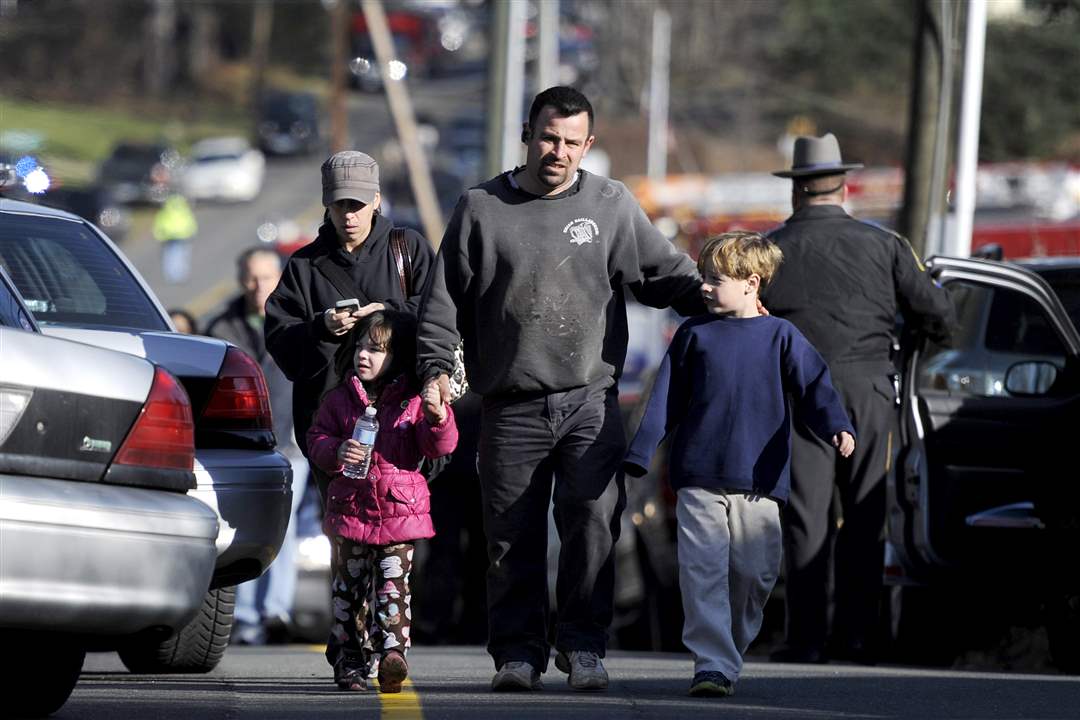 Parents leave a staging area after being reunited with their children following a shooting at the Sandy Hook Elementary School in Newtown, Conn.