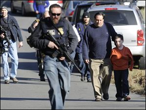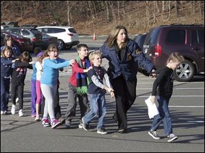 State Police lead children from the Sandy Hook Elementary School in Newtown, Conn., following a reported shooting there Friday.
