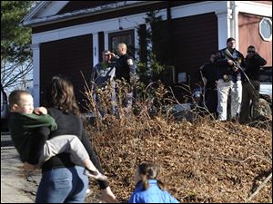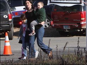 A mother runs with her children as police above canvass homes in the area following a shooting at the Sandy Hook Elementary School in Newtown, Conn.