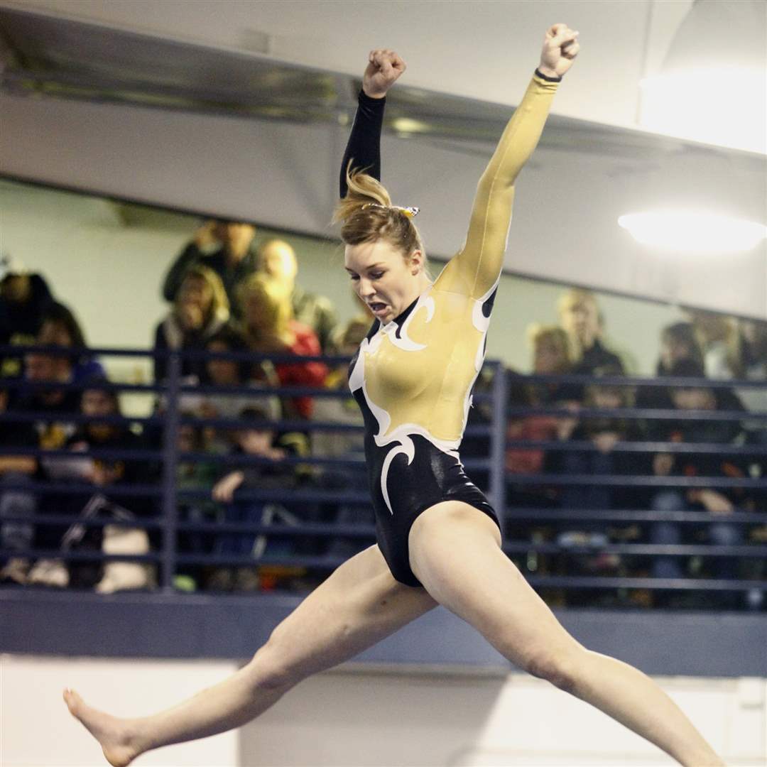 Perrysburg High School gymnast Hannah Wheeless competes in the floor exercise of the District Gymnastics Tournament.