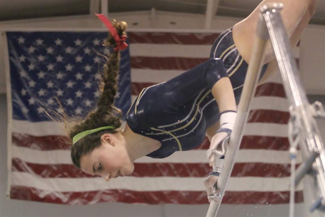 Napoleon High School gymnast Riley Dunbar competes in the bars portion of the District Gymnastics Tournament.