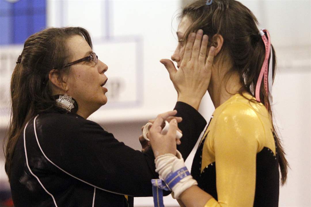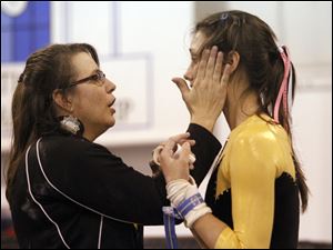 Perrysburg High School head coach Michelle Nordhaus encourages Hannah Wheeless after she competed on the bars at the District Gymnastics Tournament.