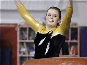 Perrysburg High School gymnast Rebecca Garber finishes her vault at the District Gymnastics Tournament.