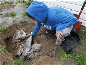 Lexus Project volunteer Carissa Curry uncovers dog bones that she and volunteer John Gibbs dug up in the backyard of a Toledo home.