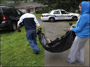 Lexus Project volunteers John Gibbs and Carissa Curry carry bones of a dog they dug up in the backyard of a home to his truck. The bones are suspected to be that of Bones, a missing dog that was involved in a New York murder.