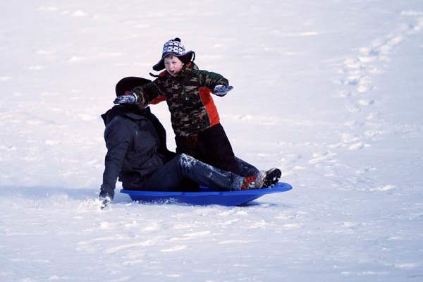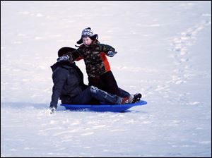 Ian Dennehy, 7, of Toledo, left, and cousin Amelia Hindmarsh, 7, of Grosse Pointe, Mich., second from left, try to snowboard down the hill. Sophia Hindmarsh, 9, Amelia's sister, third from left, rides a sled, and Ian's brother Kenny Dennehy, 8, stands on a sled with dad Joe Dennehy holding him up.