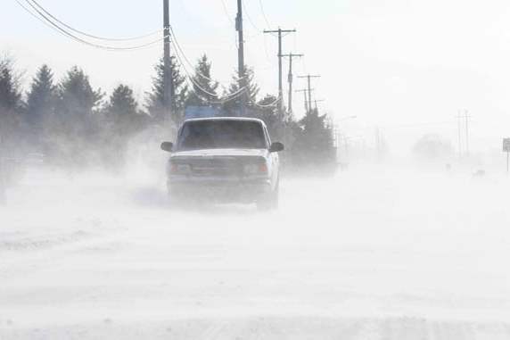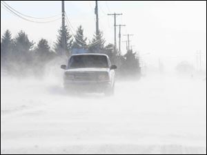 Snow drifts across Waterville Monclova Road, causing low visibility in Waterville.
