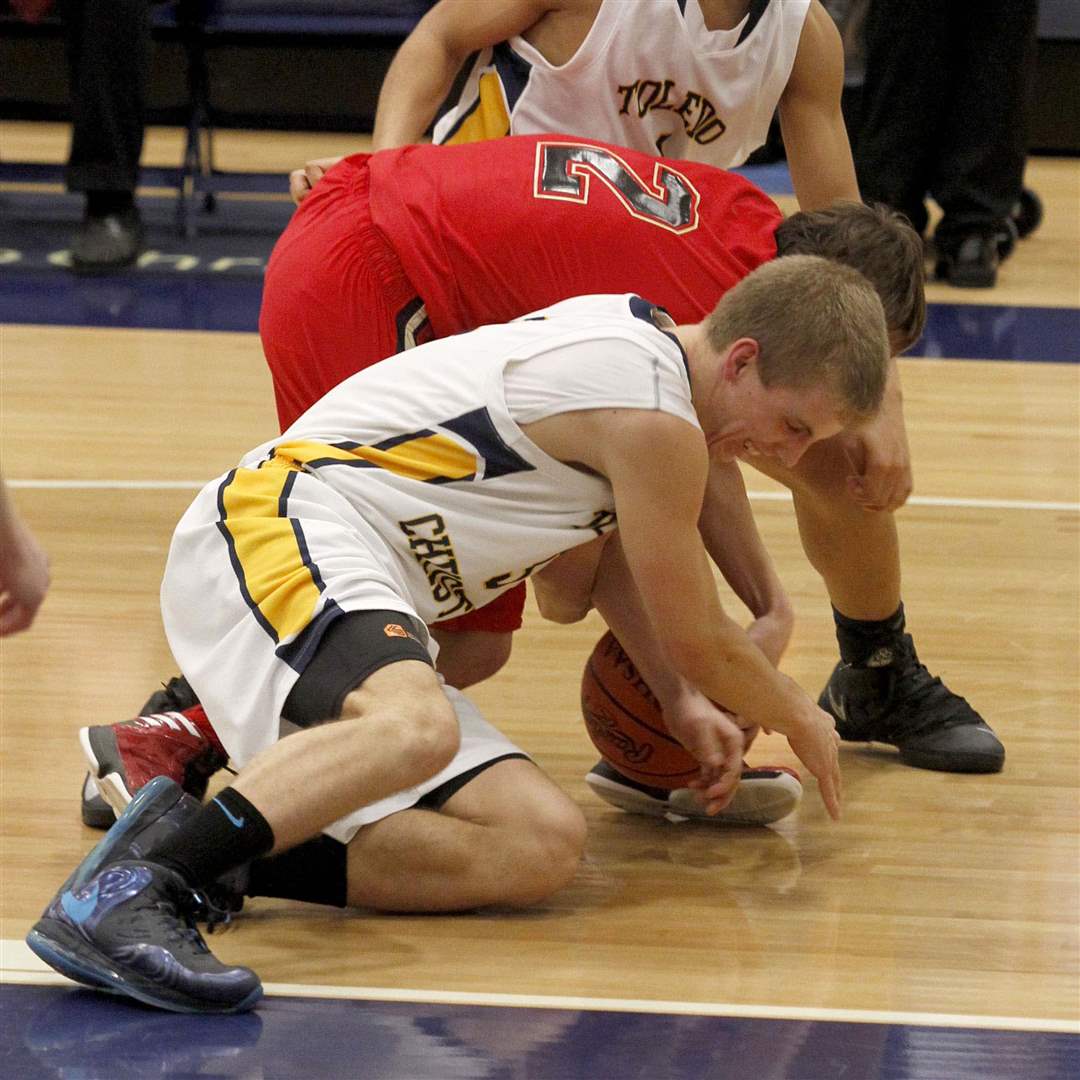 TC's Eric Celler and Cardinal Stritch's Joel McVicker fight for a loose ball.