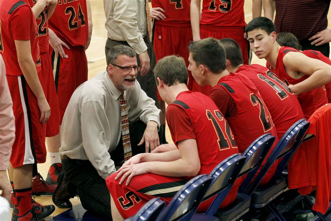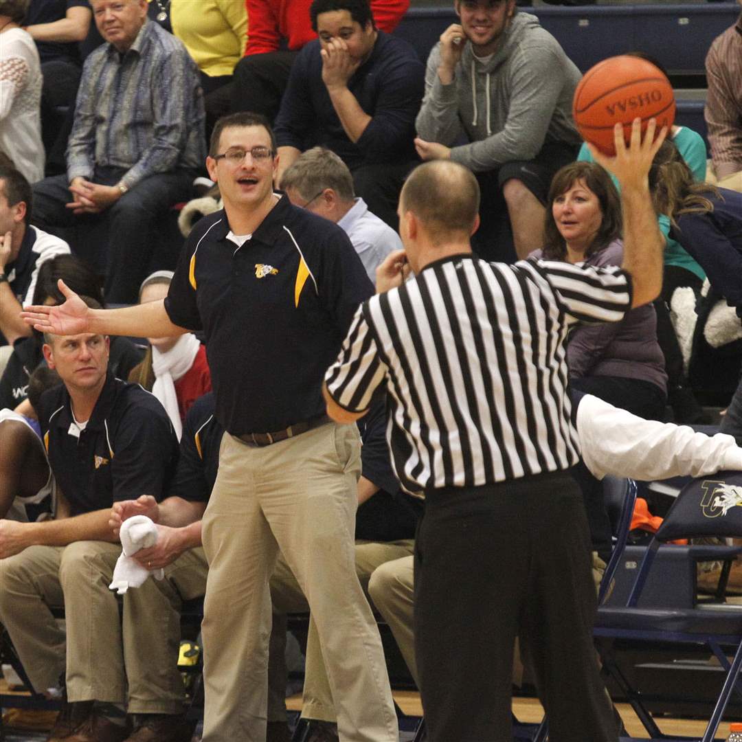 Cardinal Stritch head coach David Rieker instructs his players during a timeout.
