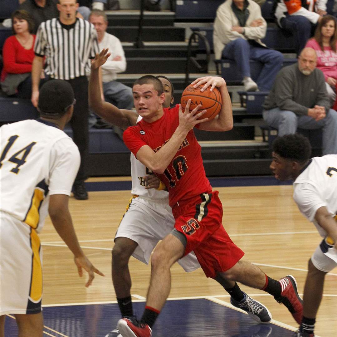 Cardinal Stritch's Austin Adams drives through TC defenders.