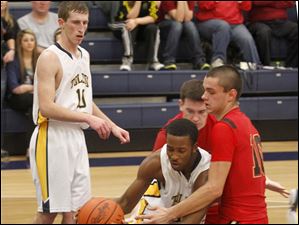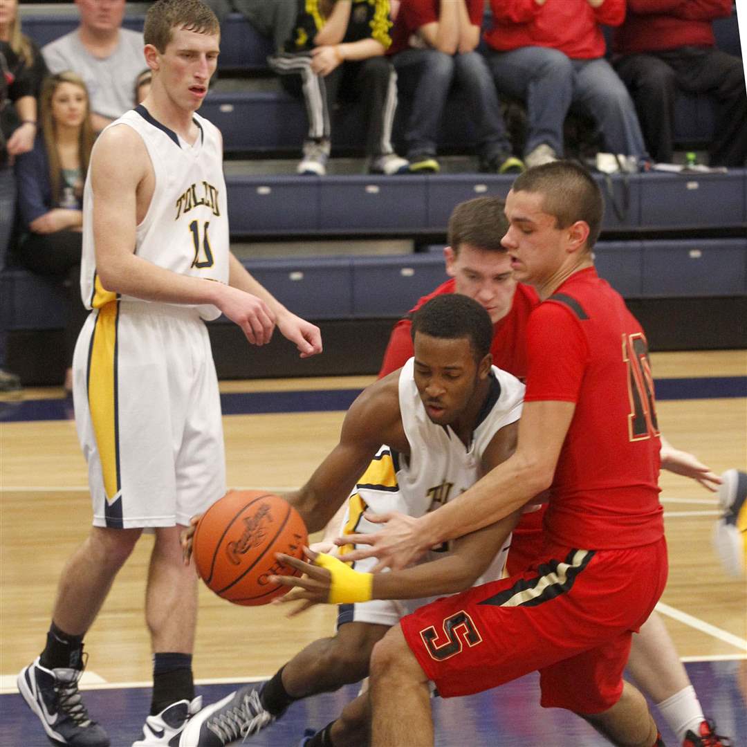 Cardinal Stritch's Austin Adams is surrounded by TC defenders.