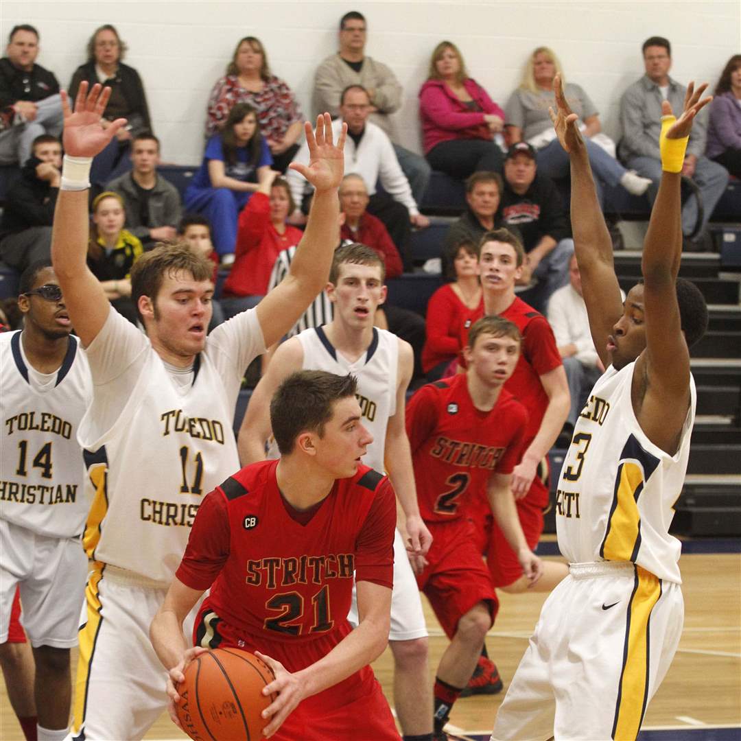 Toledo Christian's Ben Ivan guards Cardinal Stritch's Joey Cousino.