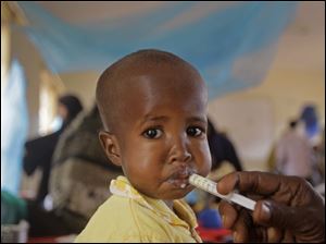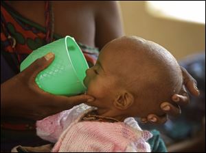 A malnourished child is fed at a hospital in Dadaab, Kenya.