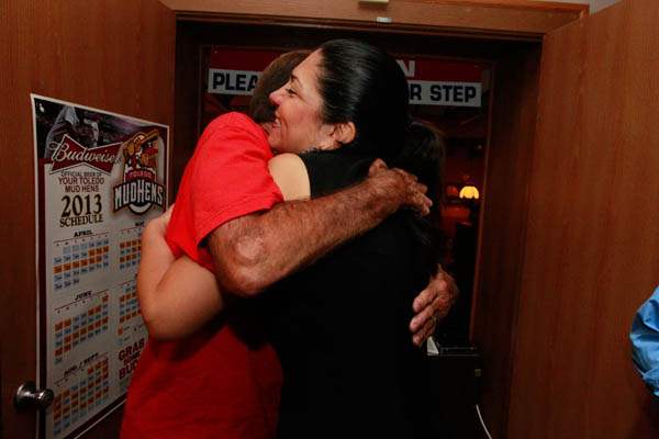 Anita Lopez hugs campaign worker John Sheets on election night at Michael's Bar & Grill on September 10, 2013.