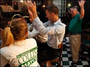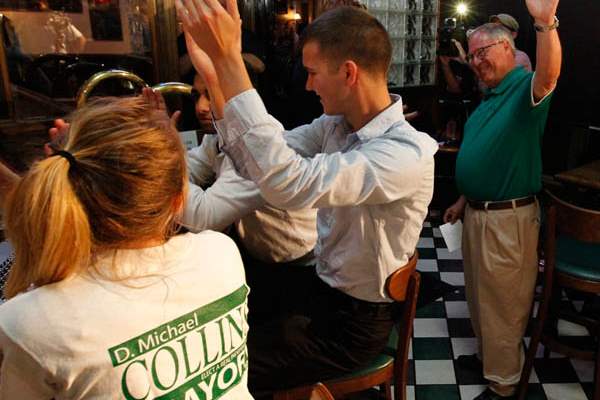 Cornelius Collins high fives his first cousin, D. Michael Collins, after the mayoral candidate took 2nd in the primary election.