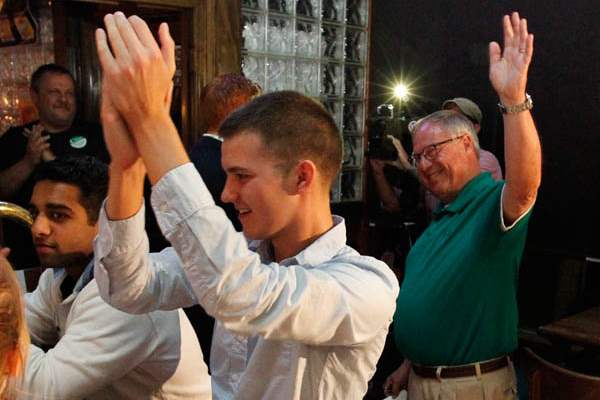 Mayor Mike Bell celebrates winning the primary election Tuesday, 09/10/13, at Mulvaney's Bunker Irish Pub.