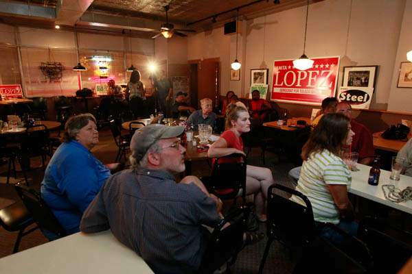 Lopez supporters watch candidates during live television coverage of the elections from Michael's Bar & Grill on September 10, 2013. Ms. Lopez had not yet appeared to thank her campaign workers and supporters.