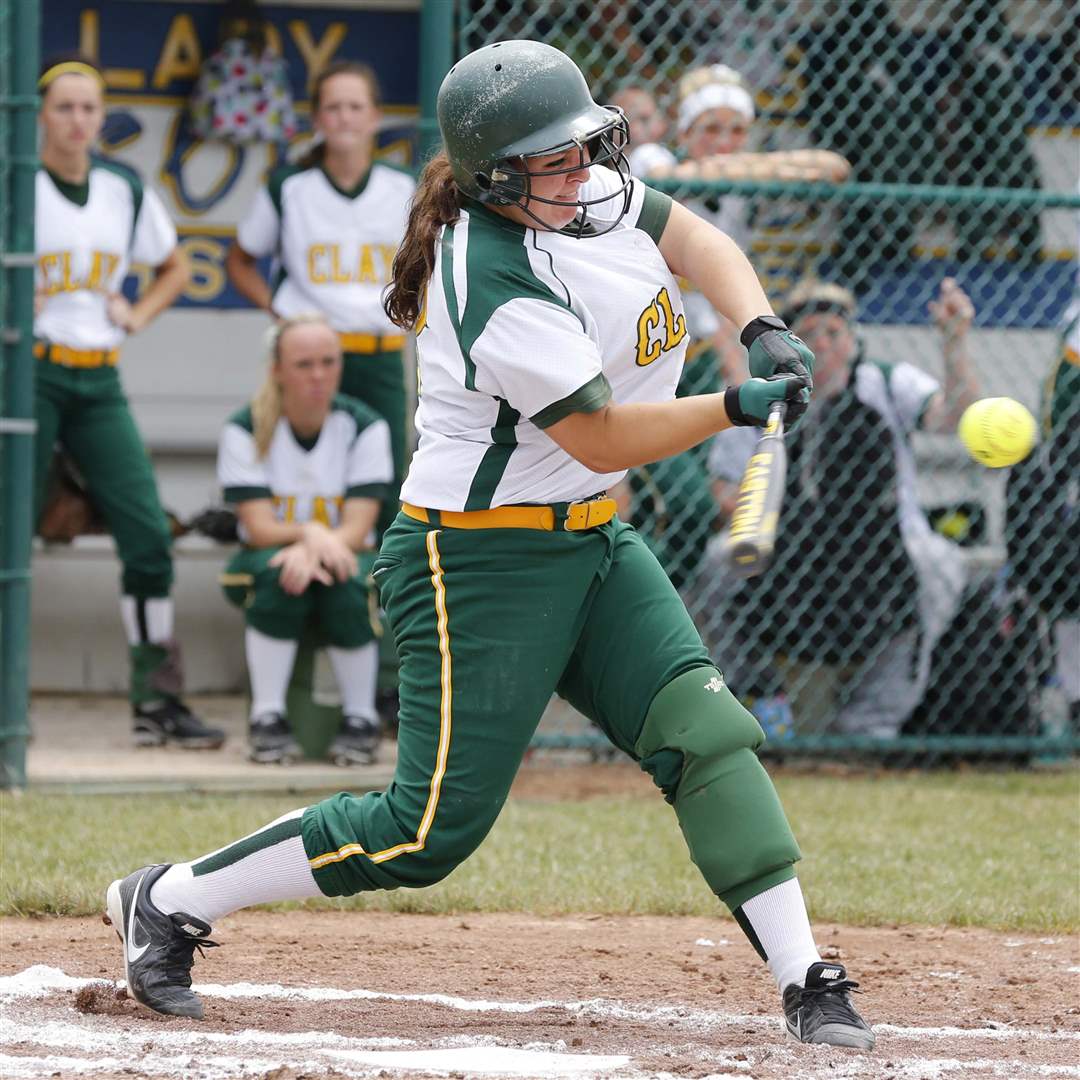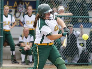 Oregon Clay's Emily Novak gets a base hit against Elyria.