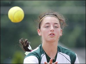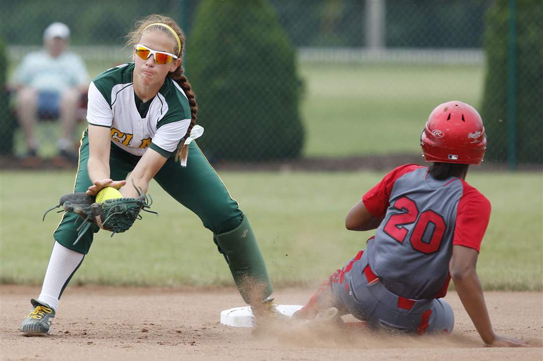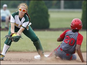 Oregon Clay second baseman Lindsay Schiavone makes a play against Elyria during the seventh inning.