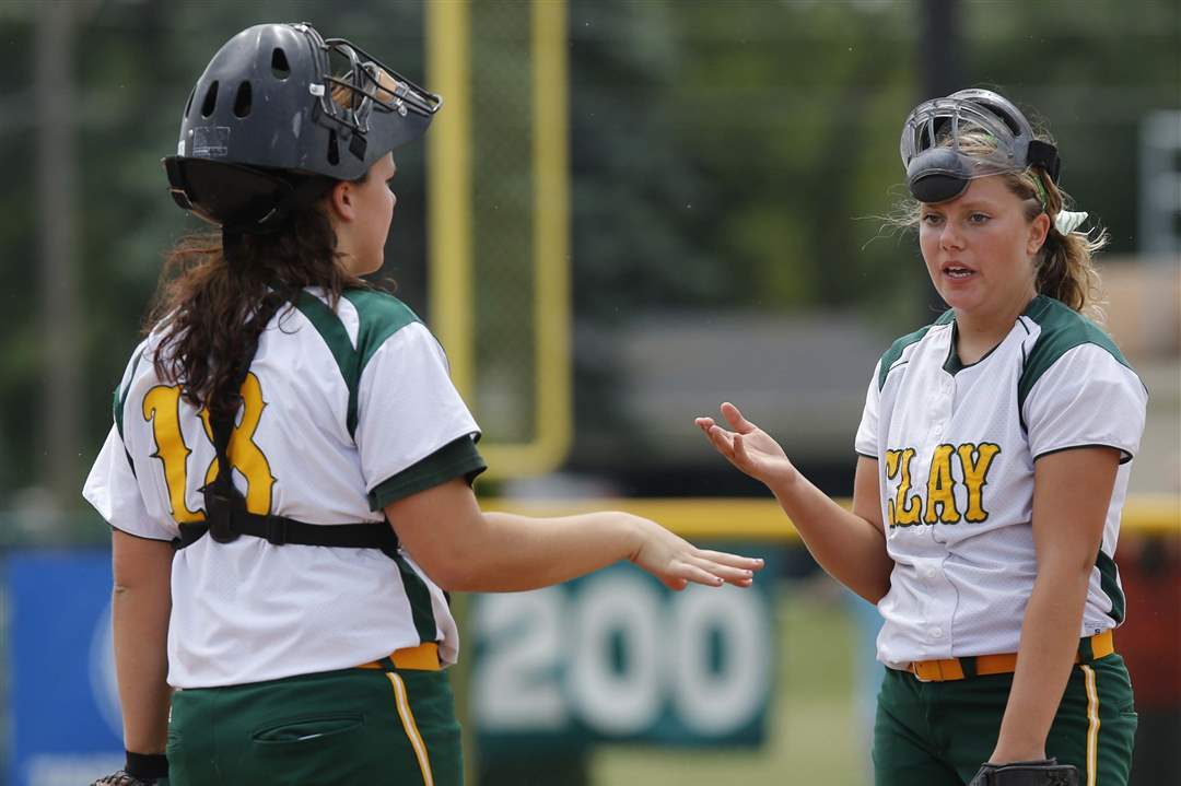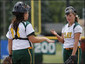 Oregon Clay pitcher Brooke Gallaher talks with catcher Emily Novak during the sixth inning.