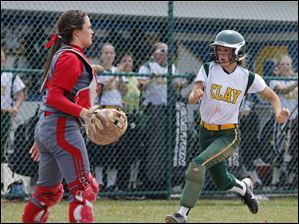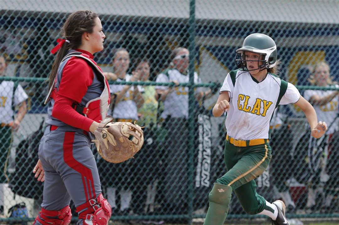 Oregon Clay's Courtney Quinlan scores against Elyria during the fifth inning.