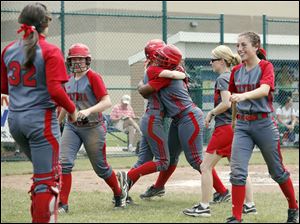 Elyria's Carly Bachna (5), left, hugs Alexis Roseboro (20) after hitting a three-run-homer against Oregon Clay during the sixth inning.