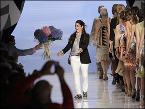 Italian designer Veronica Etro receives a bouquet of flowers at the end of the presentation of her Spring-Summer 2012 fashion collection in Milan, Italy.