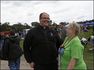 Father Eric Schild, left, talked with Karen McCarthy during this year's Exclaim Festival.