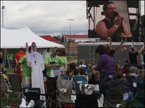 Scott Graham, 16, of Adrian, Mich., prayed with the rosary outside the adoration tent during this year's Exclaim Festival. The afternoon featured live music, vendors, food, games and tents for both adoration of the Eucharist and reconciliation. Hundreds of people turned out for the afternoon, despite the intermittent rain.
